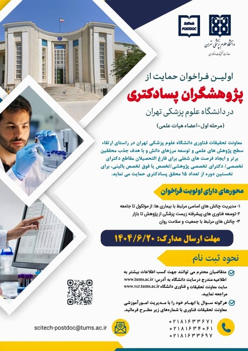 اولین فراخوان حمایت از پژوهشگران پسادکتری در دانشگاه علوم پزشکی تهران (مرحله اول ، اعضاء هیات علمی) SciTech POSTDOC